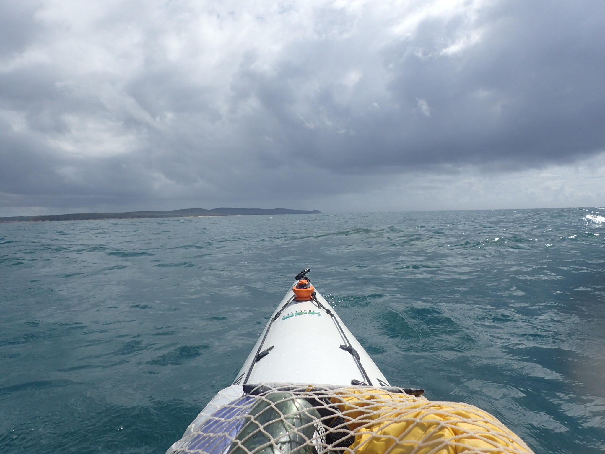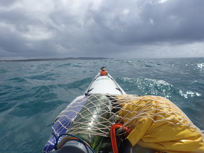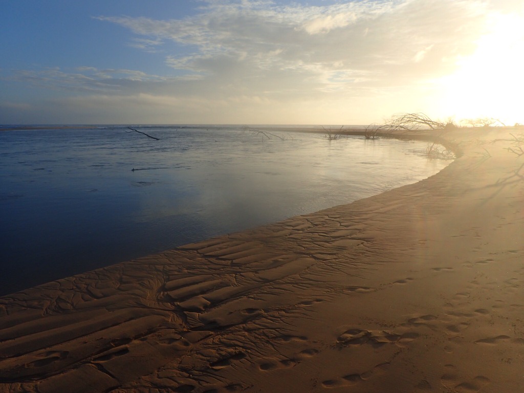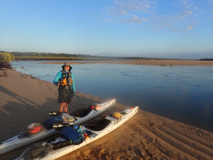 The start of today saw us with the most complex launch of the trip. It was complex as we were paddling out of an estuary on an outgoing tide, punching over a bar with metre waves breaking whilst avoiding a large number of trees which were embedded in the estuary – yes my definition of fun. Our 38 km run up the coast was fairly hard work with a good breeze at our backs with a 1.2m ish rolling swell which gave us a serious case of waggly backside, of course this means the back of the kayak keeps being picked up and turned from one side to the other.